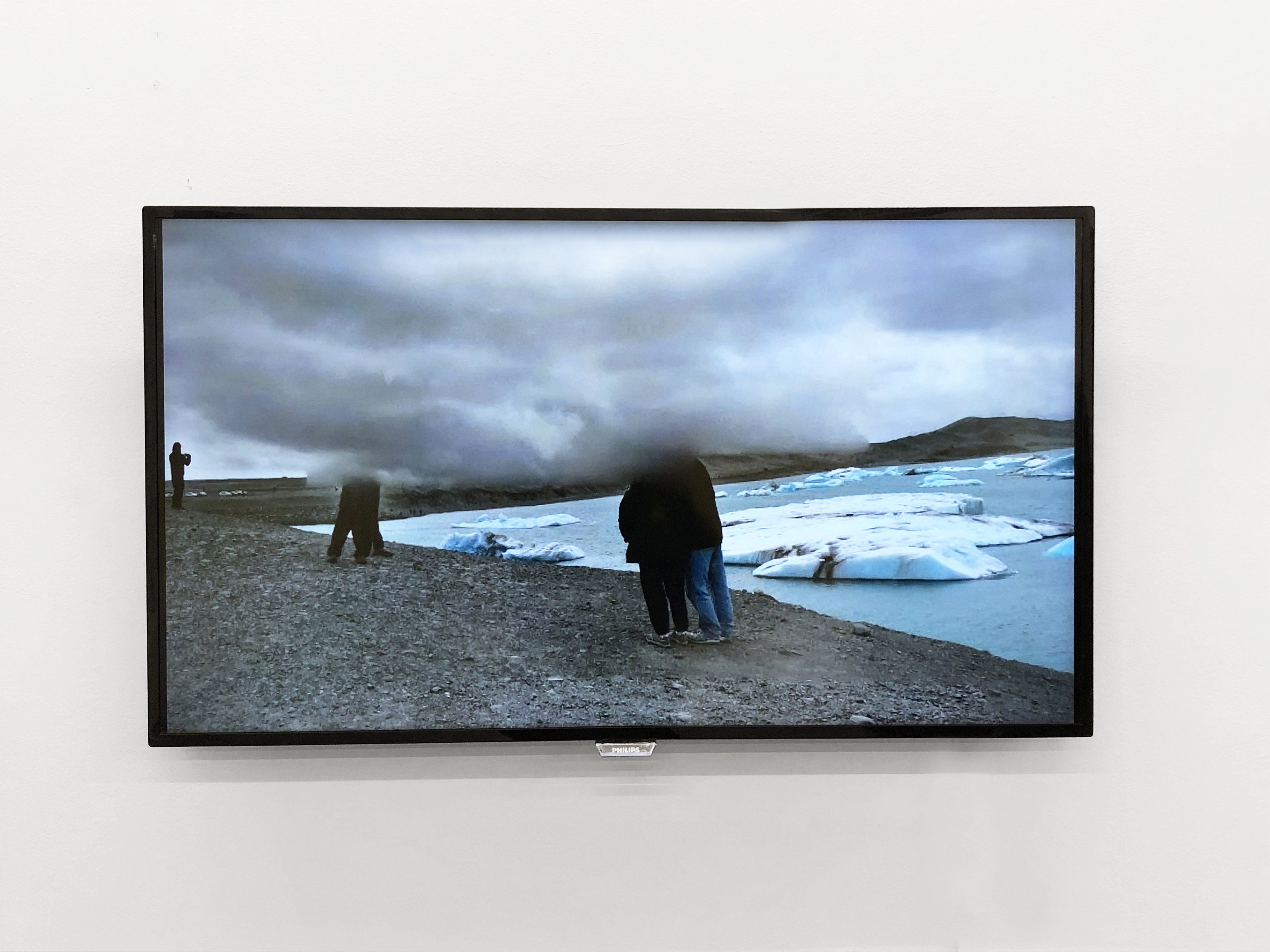 Episode 3 of The Day the Earth Caught Data was an interactive installation involving audience participation using primarily online material shared by different users through Google Street View Photosphere. The research is focused on Jökulsárlón, the famous glacial lake in the southern part of Iceland, which is undergoing unprecedented changes due to global warming. The use of the satellite images generated by Google Earth along with screenshots taken from the online photos shared by the visitors in Google Earth’ Photosphere, construct a different, more dystopian narrative. The landscape resembles that of another planet, or that of a doomsday movie setting, where the individuals strolling around look lost, exhausted and disoriented amidst the melting glaciers and barren, uninviting surroundings. The audience was encouraged to participate, by taking their own selfies on the mirror opposite the printed backdrop.
